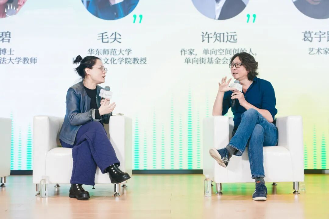 ▲2025年11月29日,毛尖与许知远在中文播客大会上。主办方供图