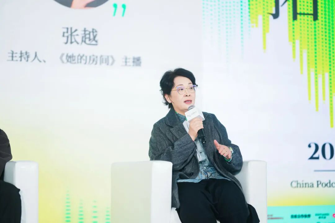 1995年,张越主持的节目《半边天》开创了女性访谈的先河。2022年从央视退休后,她转型做自媒体,于2024年推出了女性对话类播客《她的房间》。张越说,退休后她曾因为害怕舆论场上愈演愈烈的争吵,一度决定再也不做媒体相关的事情了,做播客是受到自己一位学生的鼓动。那位学生是重度的播客爱好者,给张越推荐了很多播客范本并告诉她,你放心,那边一般不吵架,而且听众有耐心,可以用很长时间把一件事说清楚。