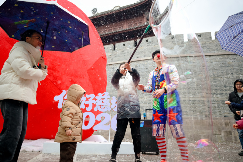 大东门瓮城的爱心气膜旁,民权路街区的“冬日初雪”缓缓飘落,轻柔的泡沫雪花随风轻扬,让古城瞬间披上银装。活动现场布置的新年美陈墙也成为打卡热门地。