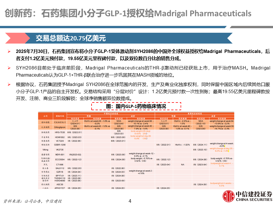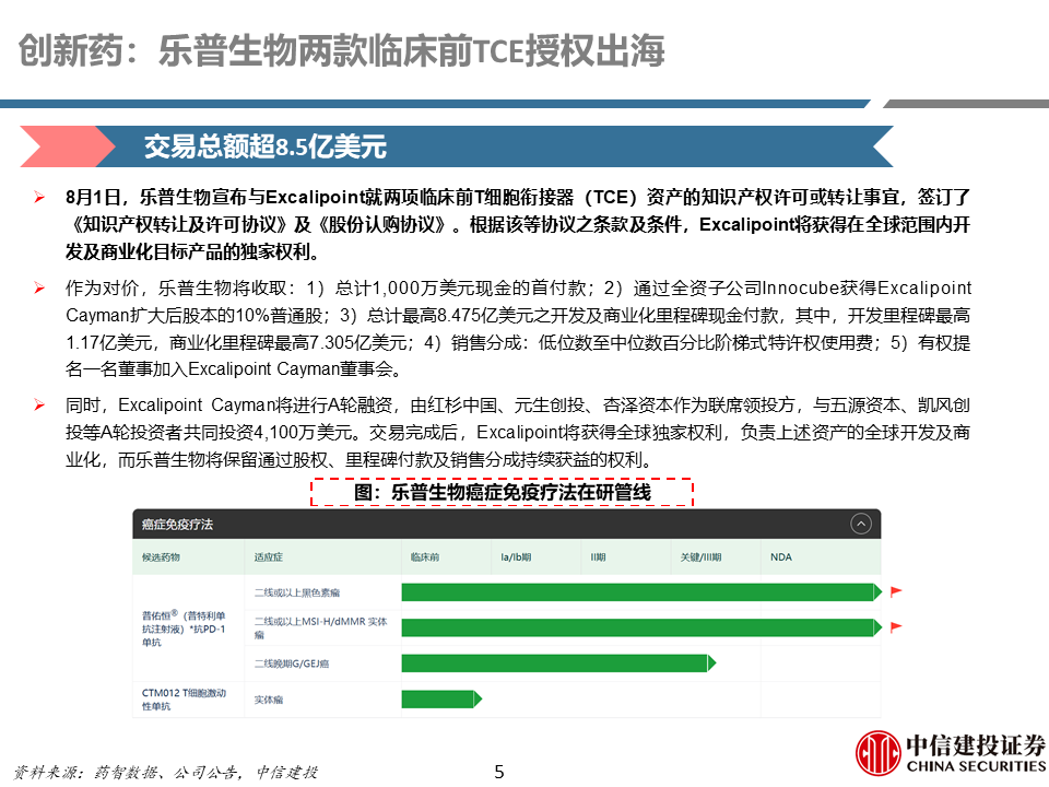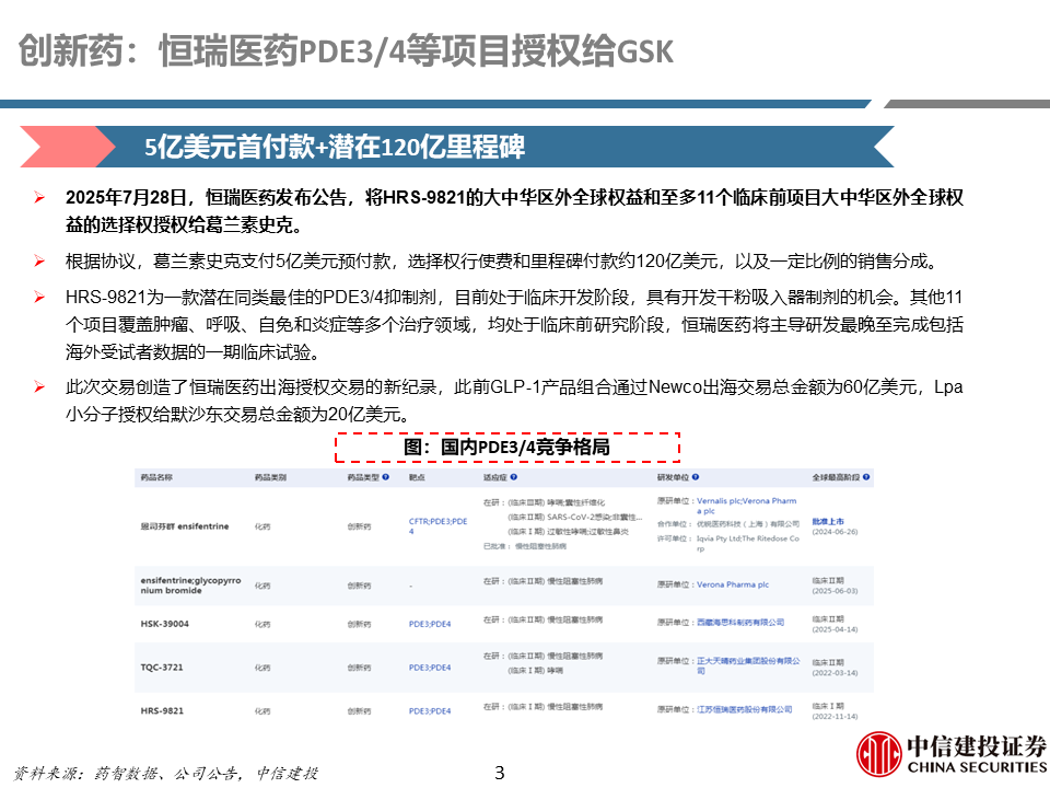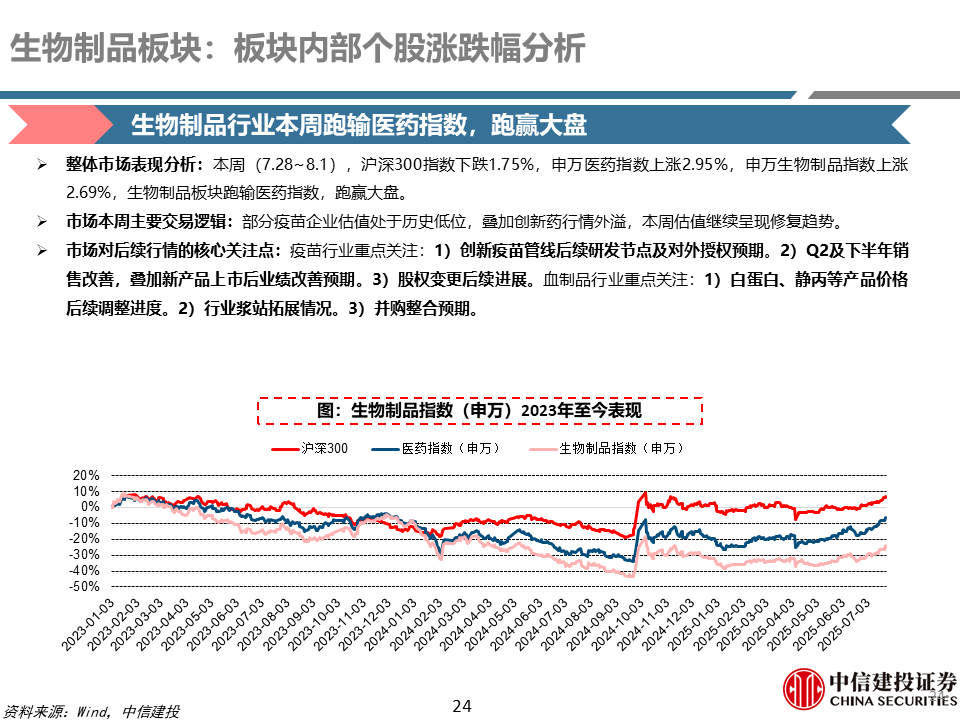 制药产业链:本周制药行业表现较好,恒瑞医药与GSK达成总计125亿美元的包括PDE3/4等12个项目的BD合作;石药20亿美金授权口服GLP-1出海;乐普生物两款临床前TCE授权出海,交易总额超8.5亿美元;康方生物PD-1/VEGF双抗依沃西单抗注射液联合化疗一线治疗晚期鳞状非小细胞肺癌申报NDA;海思科环泊酚获FDA批准上市。后续可持续关注主要公司产品临床研究进展、上市进度、WCLC/ESMO、中报业绩等。