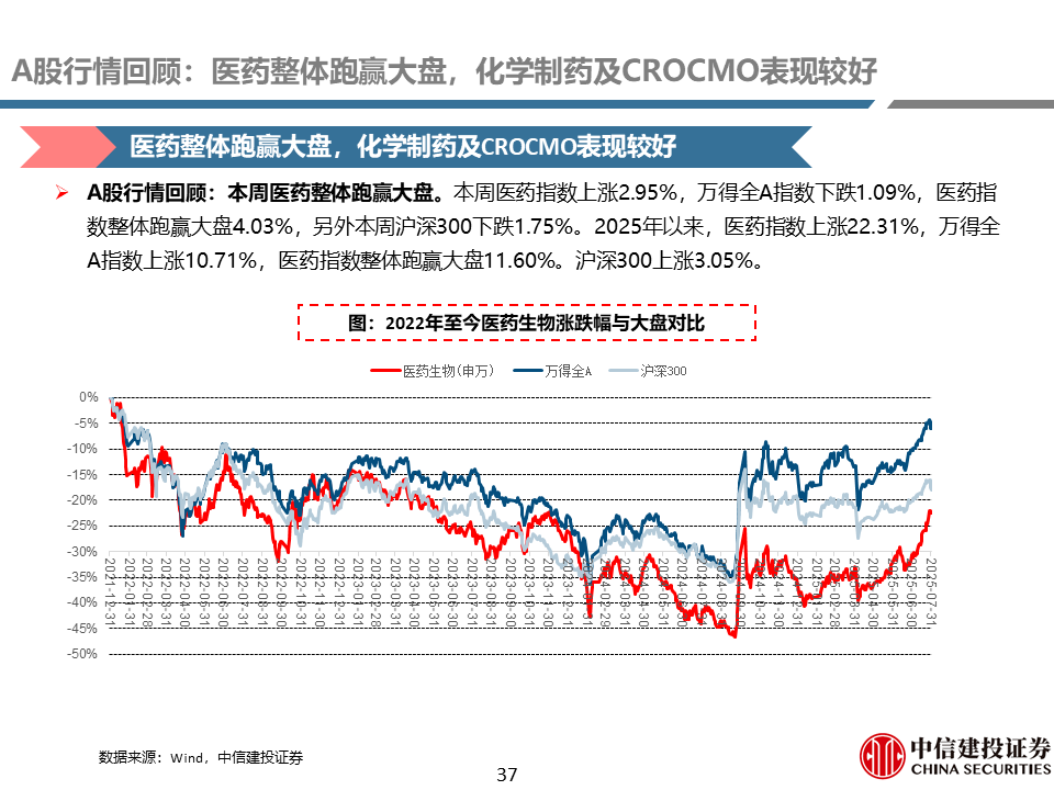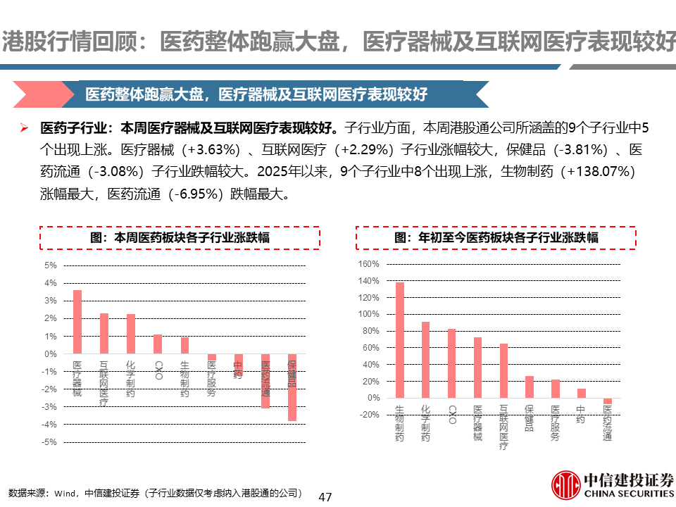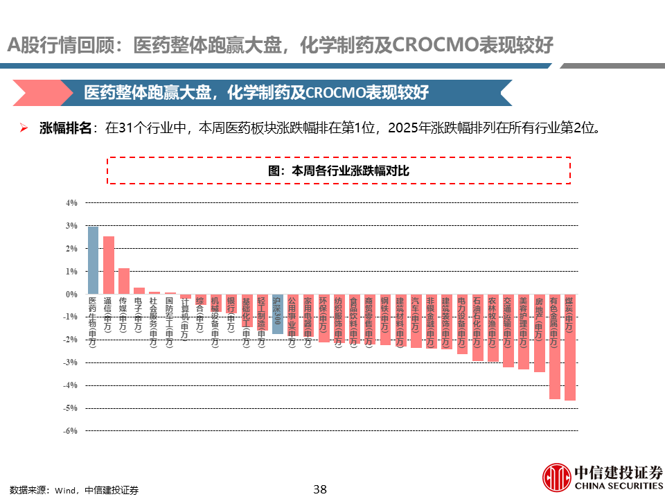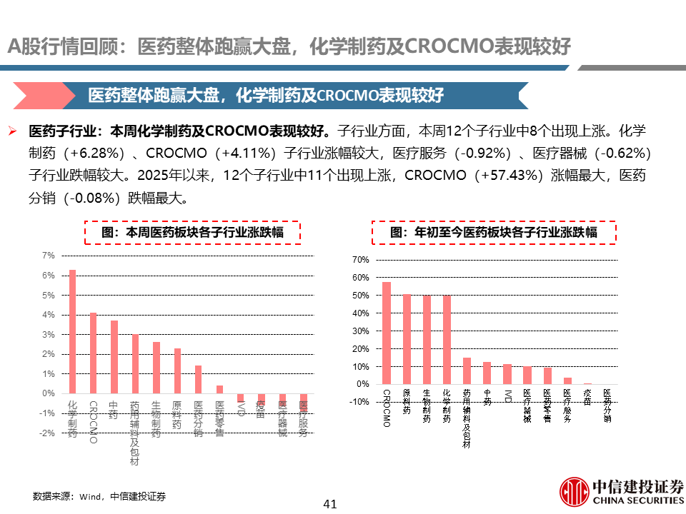 A股行情回顾:本周医药整体跑赢大盘,化学制药及CROCMO表现较好。本周医药指数上涨2.95%,万得全A指数下跌1.09%,医药指数整体跑赢大盘4.03%。2025年以来,医药指数整体跑赢大盘11.60%。子行业方面,本周化学制药(+6.28%)、CROCMO(+4.11%)子行业表现较好。