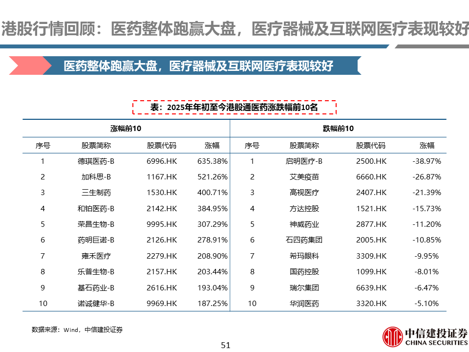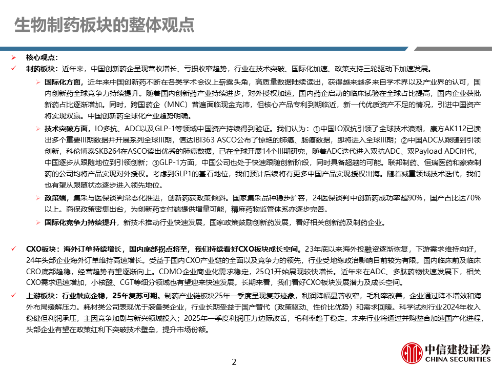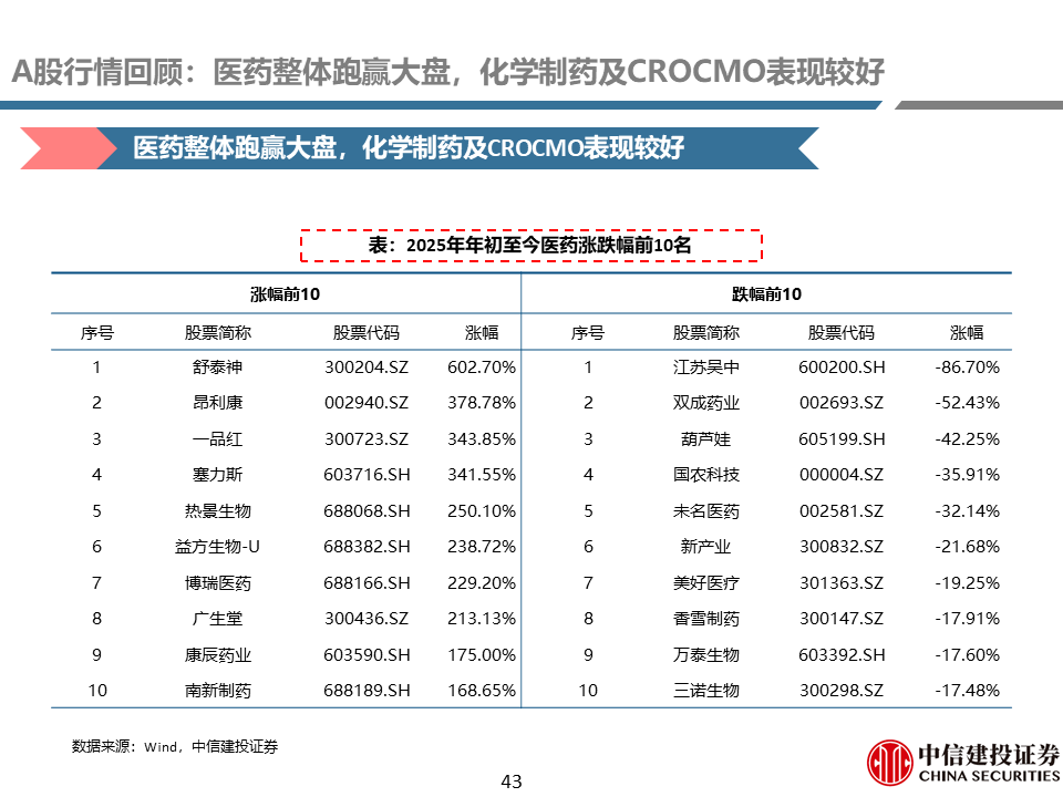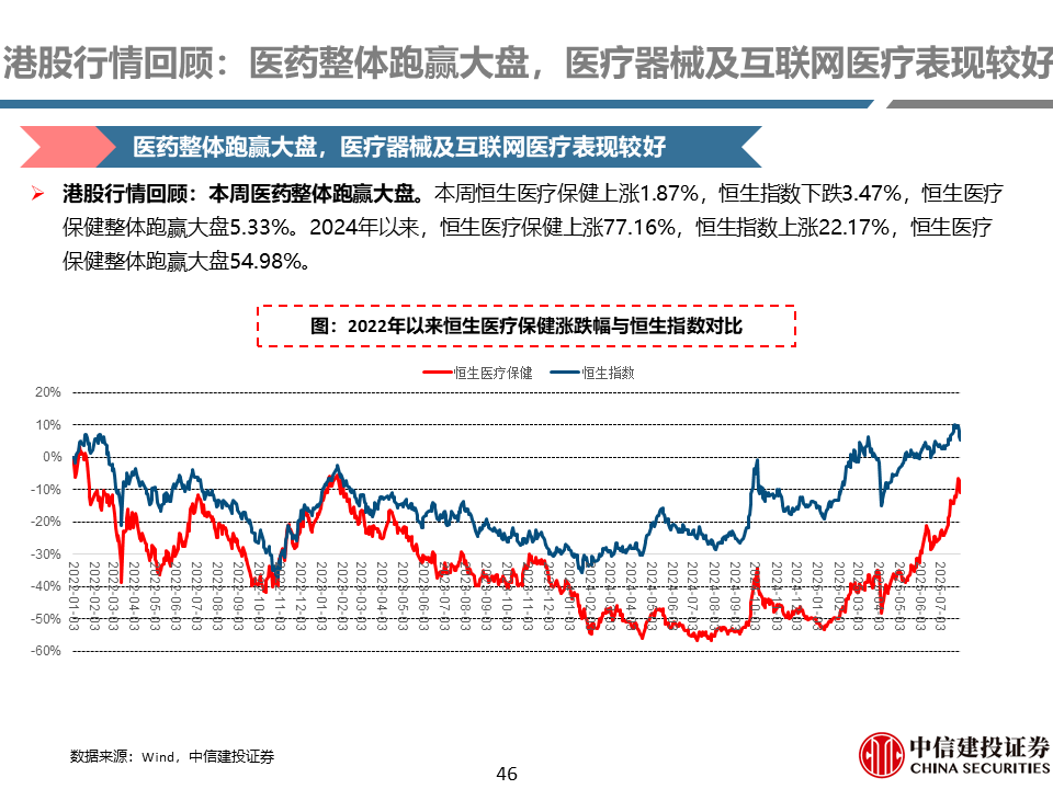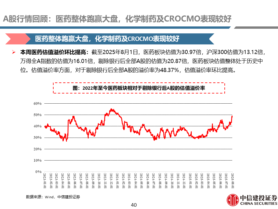 A股行情回顾:本周医药整体跑赢大盘,化学制药及CROCMO表现较好。本周医药指数上涨2.95%,万得全A指数下跌1.09%,医药指数整体跑赢大盘4.03%。2025年以来,医药指数整体跑赢大盘11.60%。子行业方面,本周化学制药(+6.28%)、CROCMO(+4.11%)子行业表现较好。