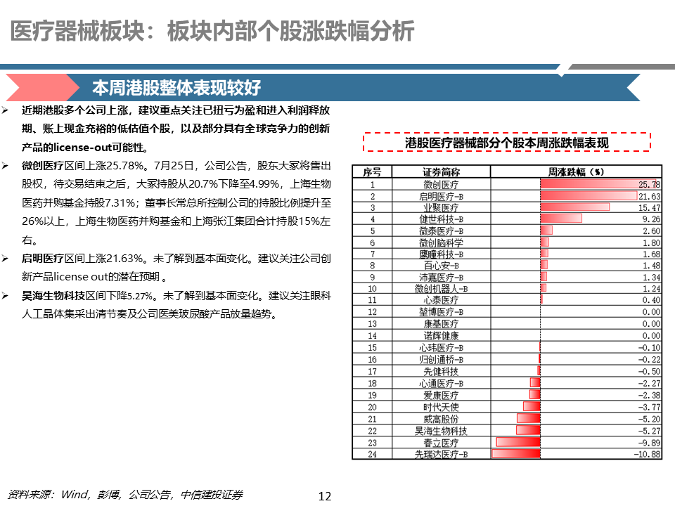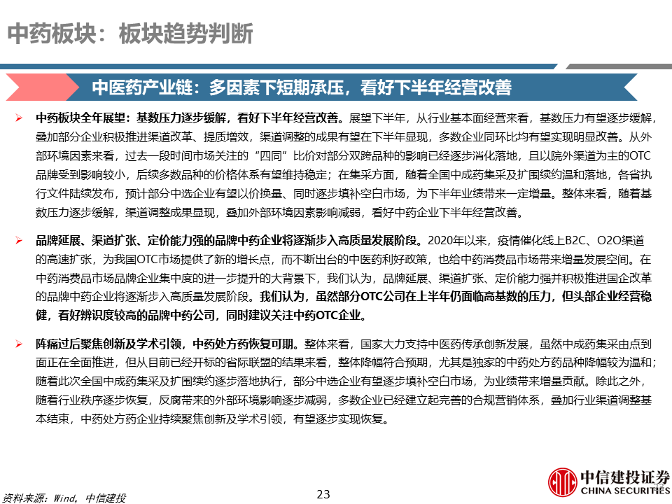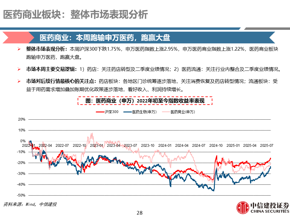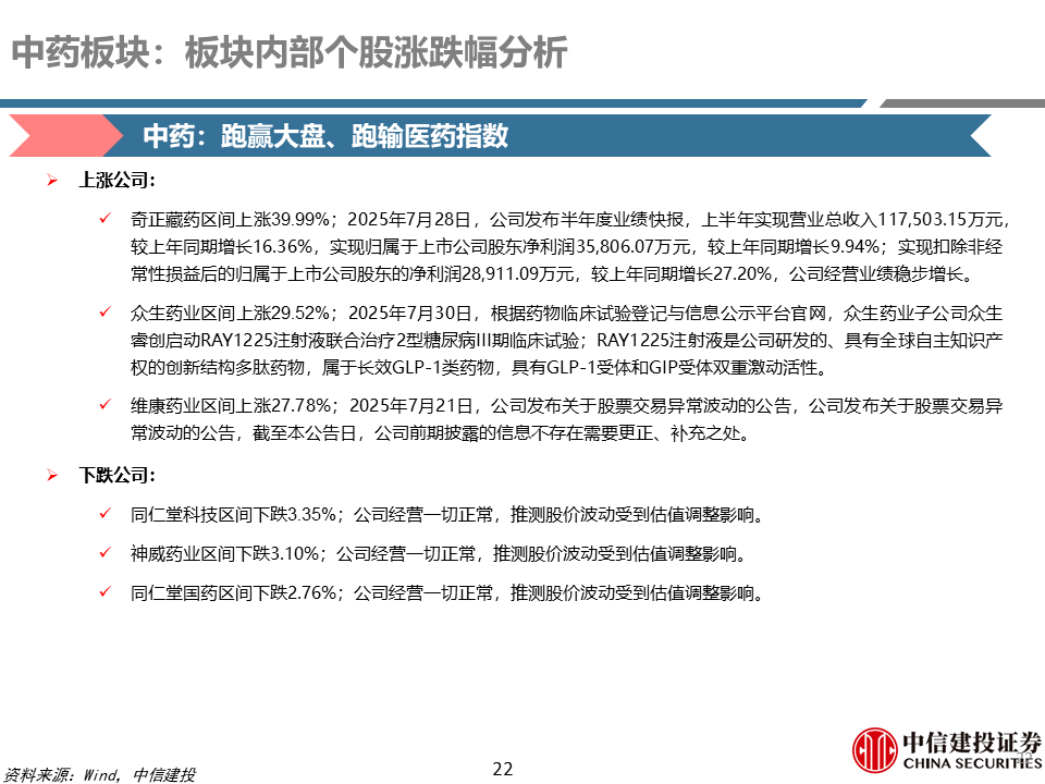 中药、生物制品及商业:1)中药:本周跑输医药指数、跑赢大盘。市场主要关注Q2业绩表现,以及中药企业跨界创新药进展;此外市场持续关注“四同药品”价格专项治理、中成药集采等外部政策环境变化等带来的影响。2)生物制品:本周跑输医药指数、跑赢大盘。部分疫苗企业估值处于历史低位,叠加创新药行情外溢,本周估值继续呈现修复趋势。3)医药商业:本周跑输医药指数、跑赢大盘。药店行业关注药店转型及二季度业绩情况;医药流通行业关注行业内整合及二季度业绩情况。