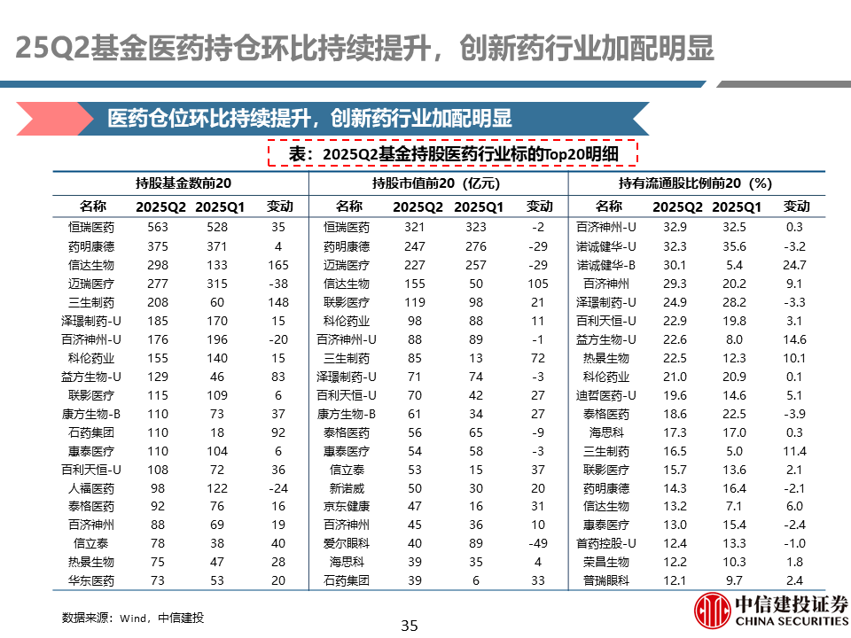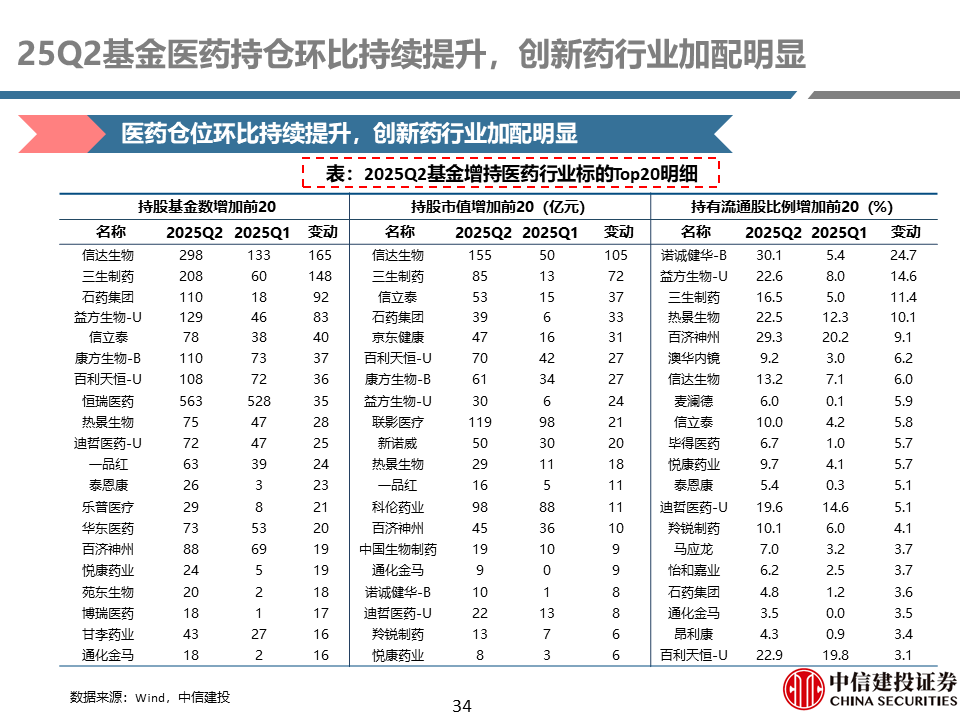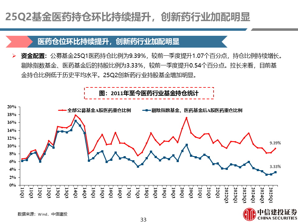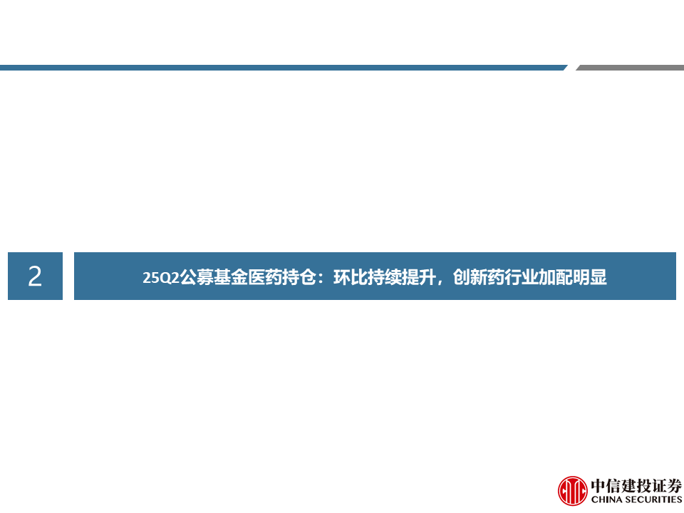 25Q2公募基金医药持仓:环比持续提升,创新药行业加配明显。公募基金25Q2医药持仓比例为9.39%,较前一季度提升1.07个百分点,持仓比例持续增长。剔除指数基金、医药基金后的持股比例为3.33%,较前一季度提升0.54个百分点。拉长来看,目前基金持仓比例低于历史平均水平。25Q2创新药行业持股基金增加明显。