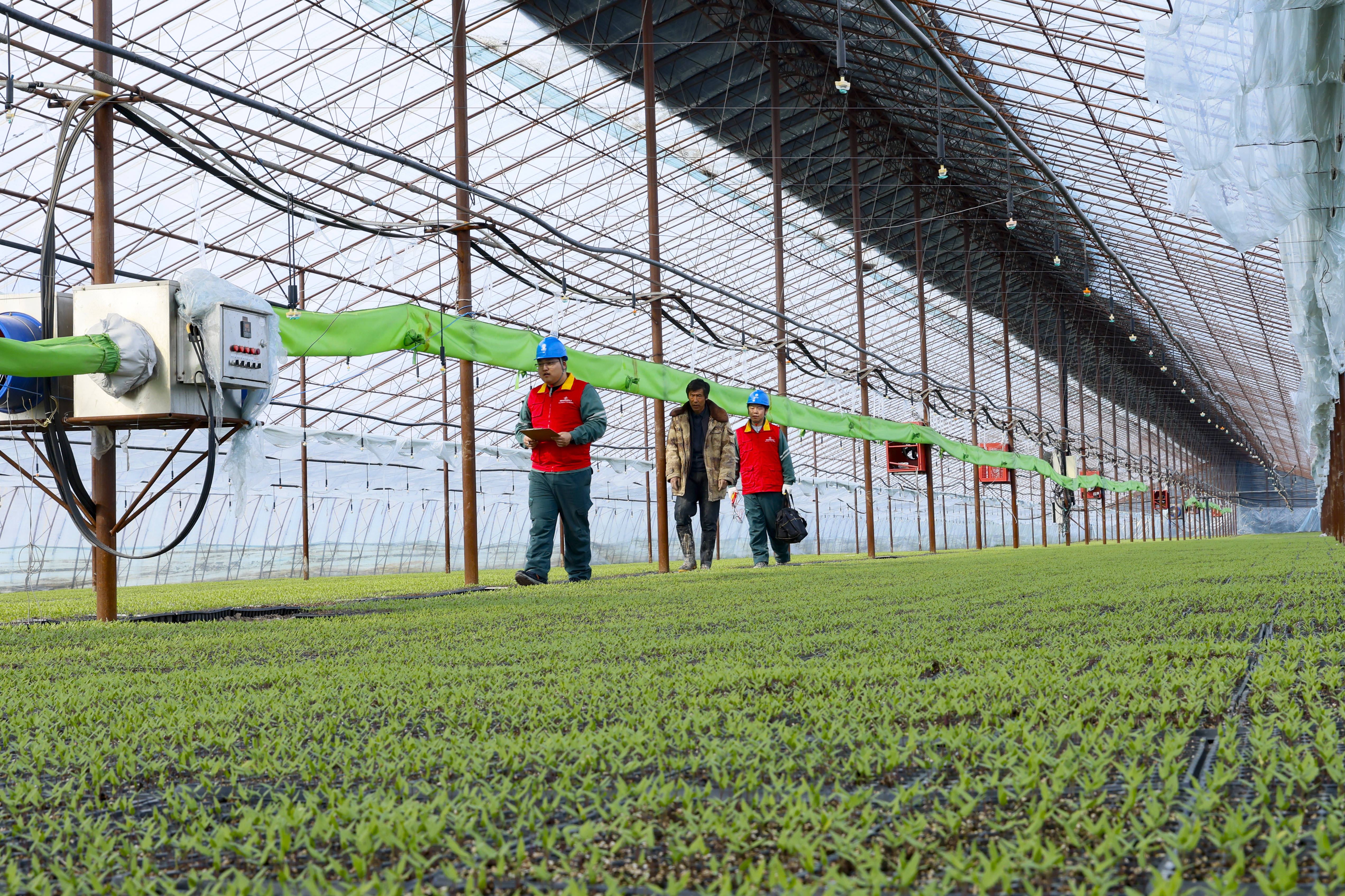 供电员工前往奎屯市开干齐乡对育苗大棚进行安全用电检查。(徐占卿 摄)在安集海镇辣椒产区,供电台区经理告诉记者,他们正通过用电信息采集系统对种植户负荷进行定向监测与预判。台区经理曾祥彬据此提供覆盖育苗、生长、采收的“全周期”上门服务,同时大力推广“网上国网”APP线上办电,将灌溉用电业扩时限压缩30%,线上办电率达到80%以上。