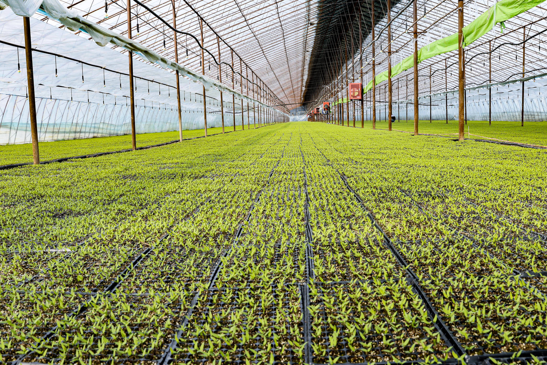 奎屯市开干齐乡智能化育苗基地内绿意盎然。(徐占卿 摄)以双合农业发展有限责任公司为例,作为奎屯市规模化育苗主体,主要从事辣椒、番茄等农作物集约化育苗,采用全电气化智能管控模式,温控、灌溉、补光等设备24小时不间断运行,对供电稳定性要求较高。
