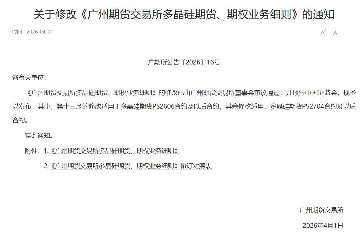 【大河财立方 记者 王宁宁】4月1日,广州期货交易所(简称广期所)发布多则公告,对多晶硅期货合约的交割质量标准、持仓限额以及风控措施进行调整。