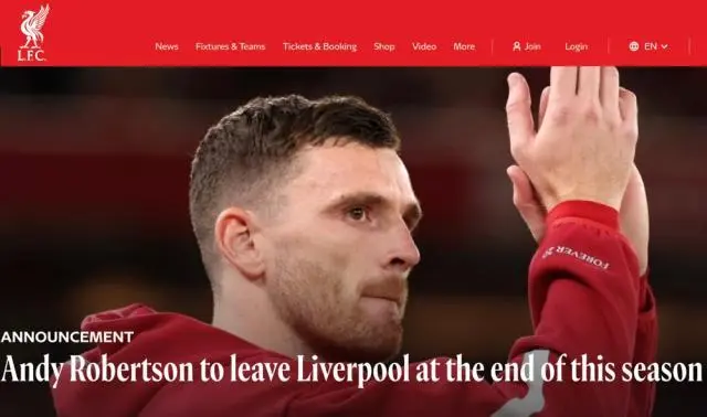 利物浦足球俱乐部官方宣布,32岁的苏格兰功勋左后卫安迪·罗伯逊将在本赛季合同结束后离开球队,“我们可以确认安迪·罗伯逊将在本赛季结束后为他的利物浦生涯画上句号。他将以一位利物浦传奇的身份告别。”