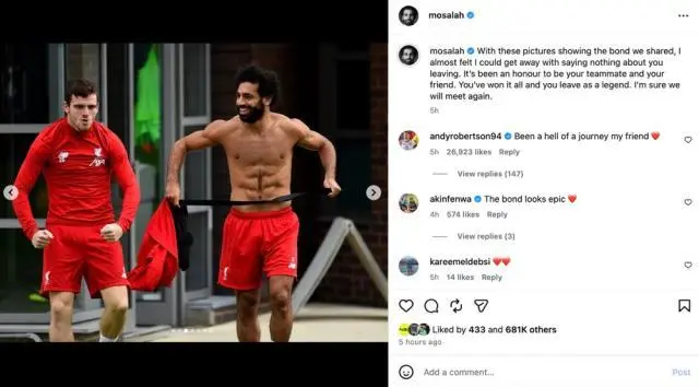 在社交媒体上,萨拉赫带头向罗伯逊发出致敬:“看着这些照片展现的我们之间的情谊,我觉得不需要再多说什么了。能成为你的队友和朋友是一种荣幸。你赢得了一切,并且以传奇的身份离开。我相信我们一定会再见。”