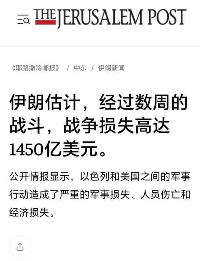 中东地区40天大战,到底损失多少?耶路撒冷邮报报道,美以对伊朗40天轰炸,造成伊朗1450亿美元损失。主要打击了伊朗军事工业、经济目标和核工业设施。